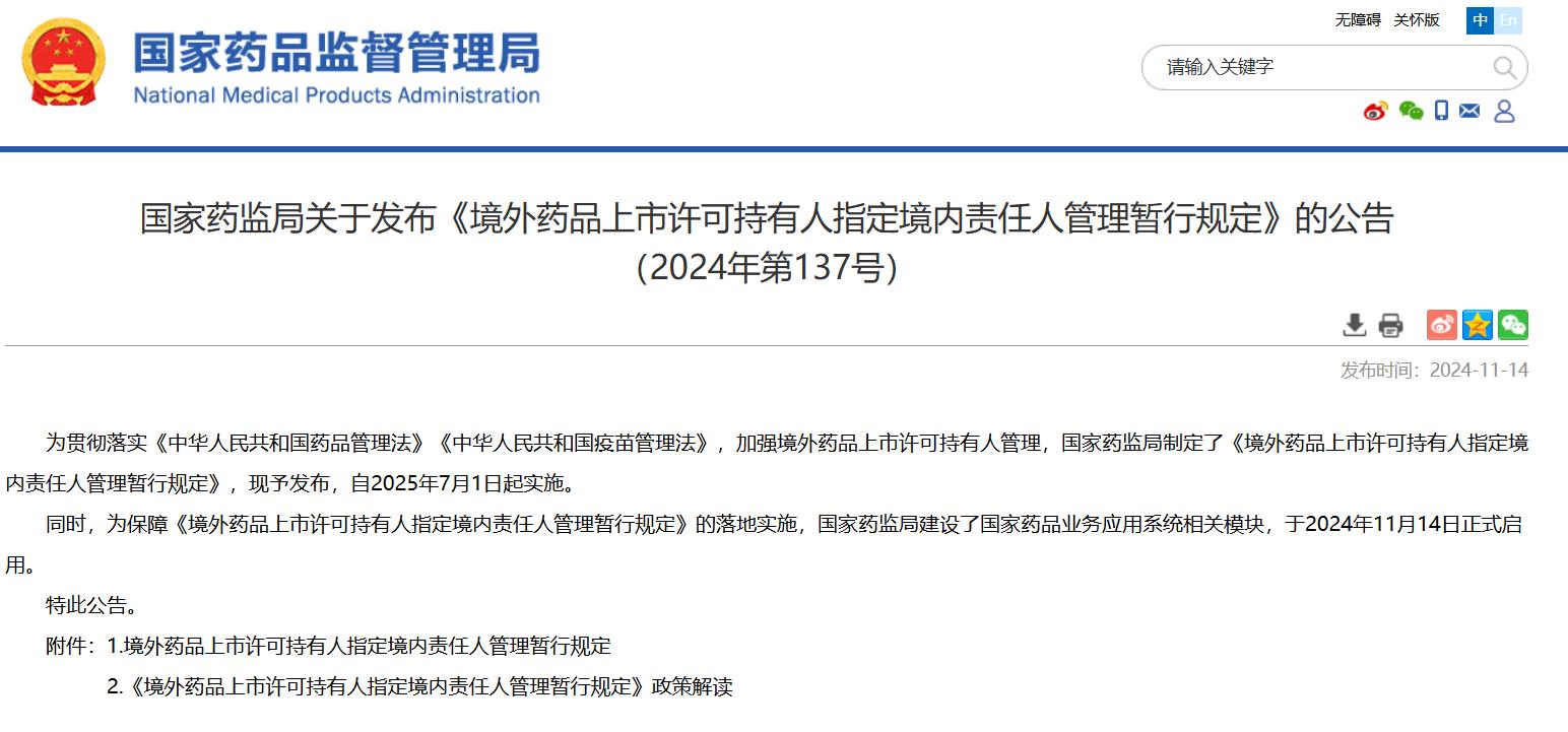國(guó)家藥監(jiān)局關(guān)于發(fā)布《境外藥品上市許可持有人指定境內(nèi)責(zé)任人管理暫行規(guī)定》的公告(2024年第137號(hào))