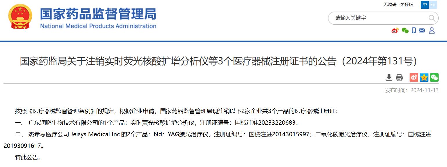 國(guó)家藥監(jiān)局關(guān)于注銷實(shí)時(shí)熒光核酸擴(kuò)增分析儀等3個(gè)醫(yī)療器械注冊(cè)證書的公告(2024年第131號(hào))