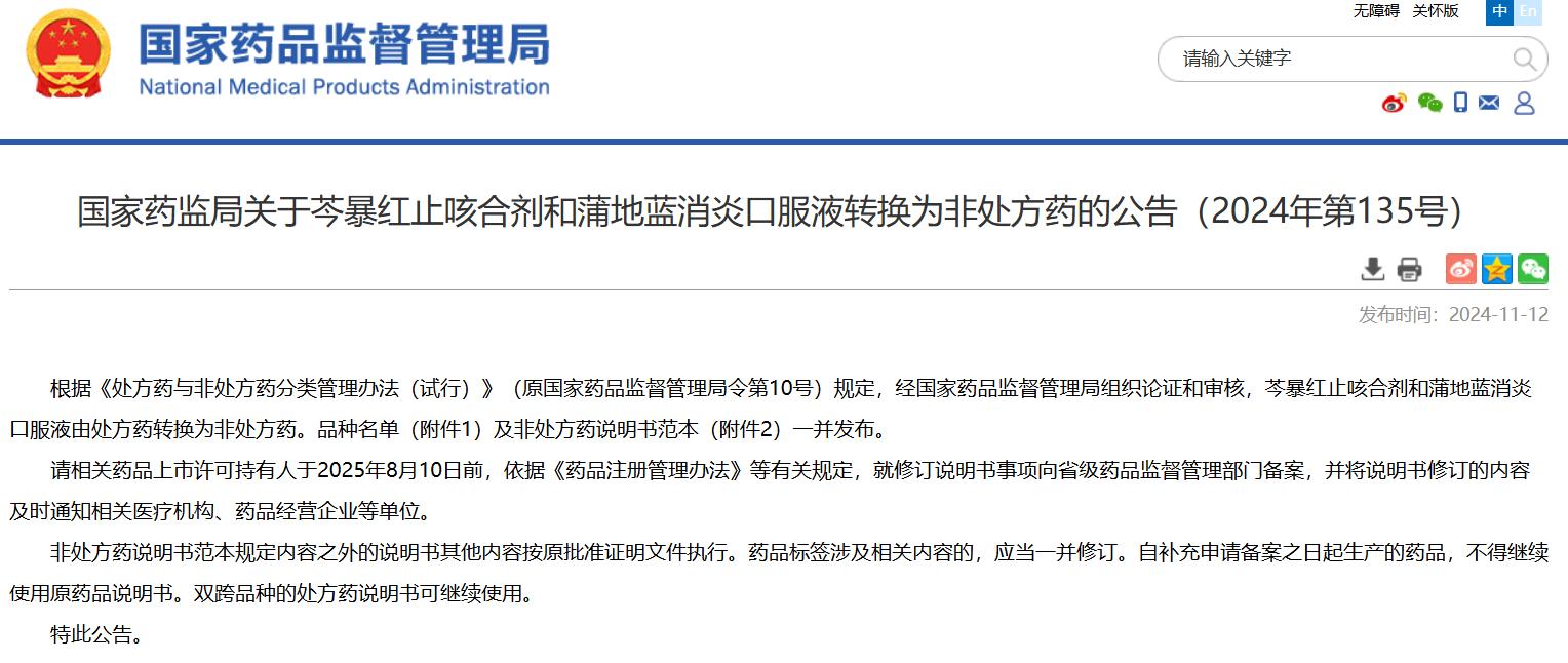 國(guó)家藥監(jiān)局關(guān)于芩暴紅止咳合劑和蒲地藍(lán)消炎口服液轉(zhuǎn)換為非處方藥的公告(2024年第135號(hào))