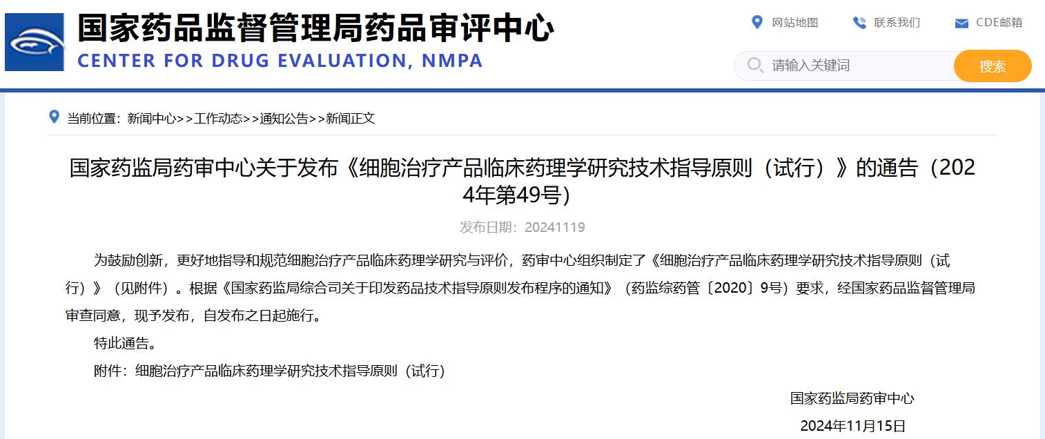 國(guó)家藥監(jiān)局藥審中心關(guān)于發(fā)布《細(xì)胞治療產(chǎn)品臨床藥理學(xué)研究技術(shù)指導(dǎo)原則(試行)》的通告(2024年第49號(hào))