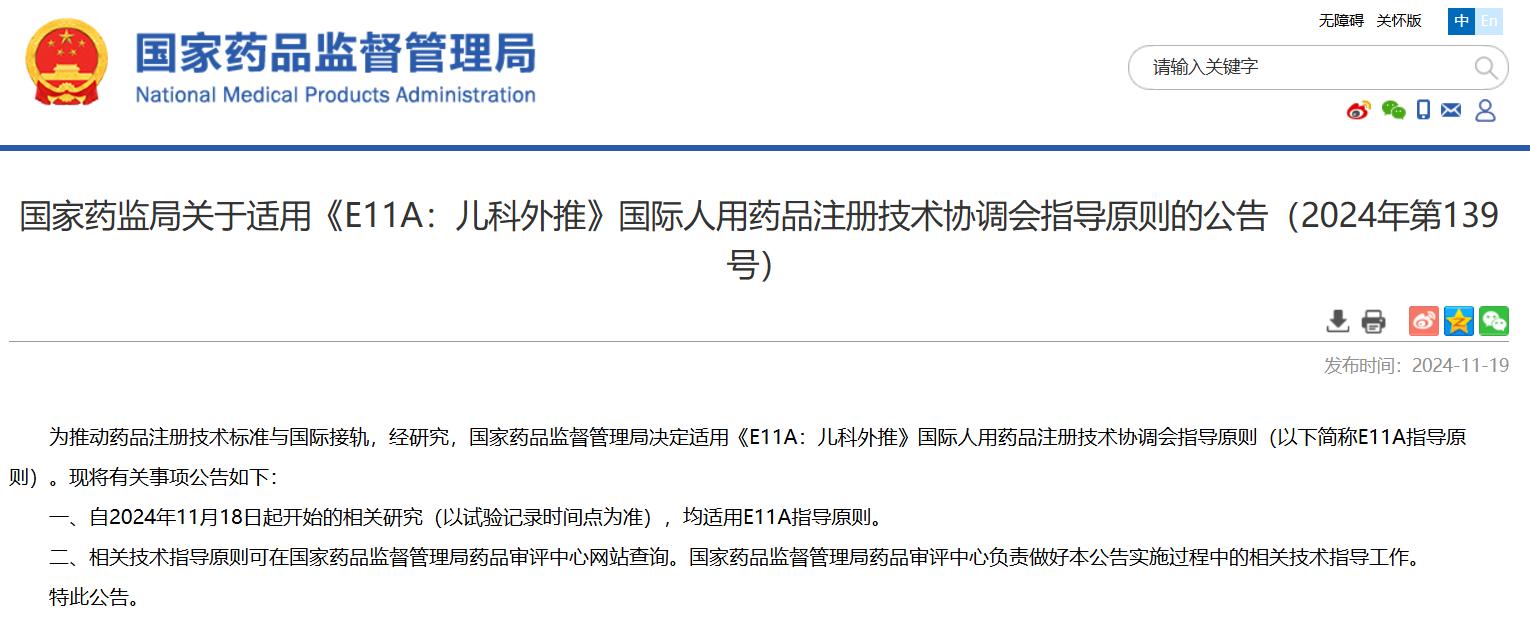 國(guó)家藥監(jiān)局關(guān)于適用《E11A:兒科外推》國(guó)際人用藥品注冊(cè)技術(shù)協(xié)調(diào)會(huì)指導(dǎo)原則的公告(2024年第139號(hào))