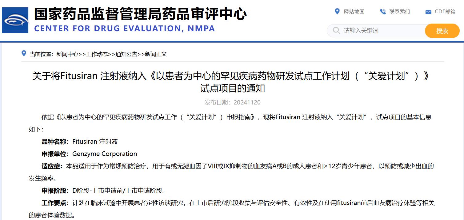 關(guān)于將Fitusiran 注射液納入《以患者為中心的罕見(jiàn)疾病藥物研發(fā)試點(diǎn)工作計(jì)劃(“關(guān)愛(ài)計(jì)劃”)》試點(diǎn)項(xiàng)目的通知
