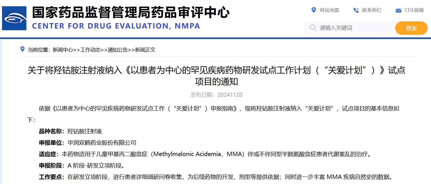 關(guān)于將羥鈷胺注射液納入《以患者為中心的罕見(jiàn)疾病藥物研發(fā)試點(diǎn)工作計(jì)劃(“關(guān)愛(ài)計(jì)劃”)》試點(diǎn)項(xiàng)目的通知