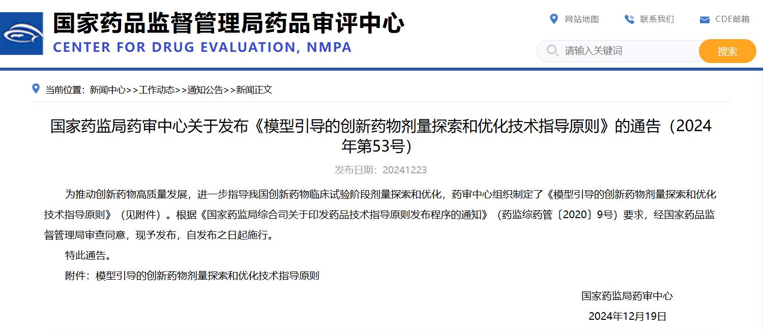 國家藥監(jiān)局藥審中心關(guān)于發(fā)布《模型引導(dǎo)的創(chuàng)新藥物劑量探索和優(yōu)化技術(shù)指導(dǎo)原則》的通告(2024年第53號(hào))