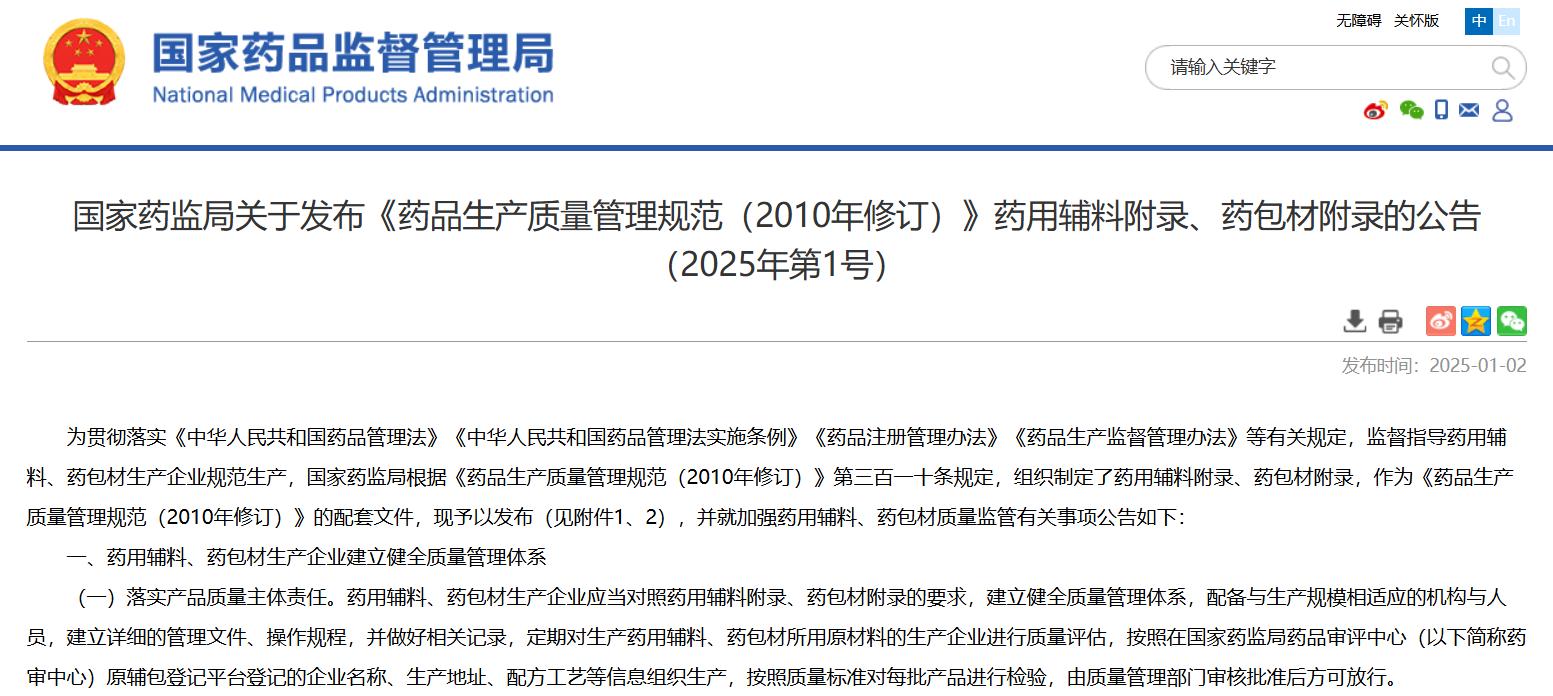 國家藥監(jiān)局關(guān)于發(fā)布《藥品生產(chǎn)質(zhì)量管理規(guī)范(2010年修訂)》藥用輔料附錄、藥包材附錄的公告(2025年第1號(hào))