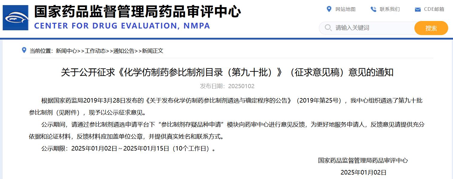 關(guān)于公開征求《化學(xué)仿制藥參比制劑目錄(第九十批)》(征求意見稿)意見的通知