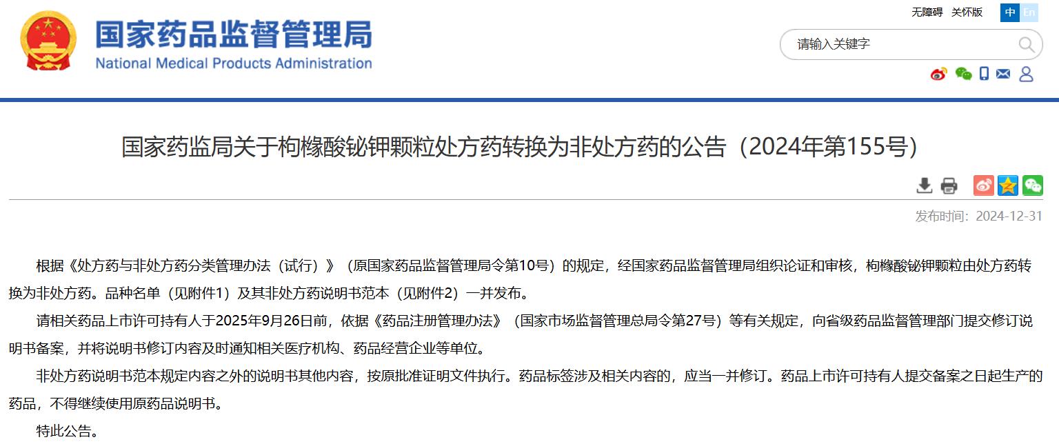 國家藥監(jiān)局關(guān)于枸櫞酸鉍鉀顆粒處方藥轉(zhuǎn)換為非處方藥的公告(2024年第155號(hào))