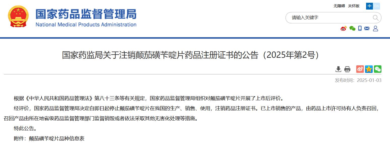 國家藥監(jiān)局關(guān)于注銷顛茄磺芐啶片藥品注冊(cè)證書的公告(2025年第2號(hào))