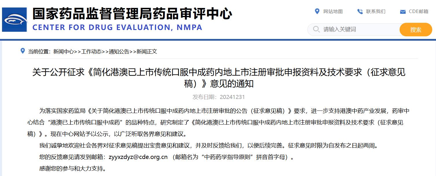 關(guān)于公開征求《簡化港澳已上市傳統(tǒng)口服中成藥內(nèi)地上市注冊(cè)審批申報(bào)資料及技術(shù)要求(征求意見稿)》意見的通知