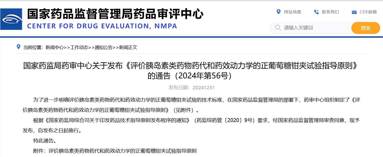 國家藥監(jiān)局藥審中心關(guān)于發(fā)布《評(píng)價(jià)胰島素類藥物藥代和藥效動(dòng)力學(xué)的正葡萄糖鉗夾試驗(yàn)指導(dǎo)原則》的通告(2024年第56號(hào))