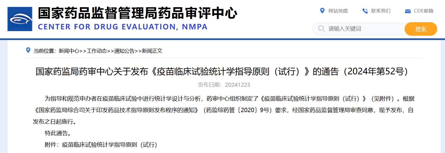 國家藥監(jiān)局藥審中心關(guān)于發(fā)布《疫苗臨床試驗(yàn)統(tǒng)計(jì)學(xué)指導(dǎo)原則(試行)》的通告(2024年第52號(hào))