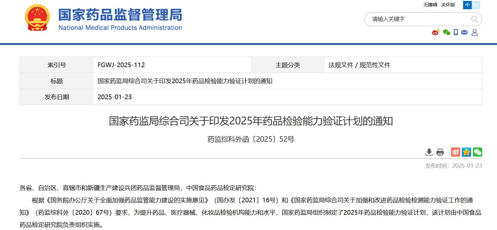 國家藥監(jiān)局綜合司關(guān)于印發(fā)2025年藥品檢驗?zāi)芰︱炞C計劃的通知