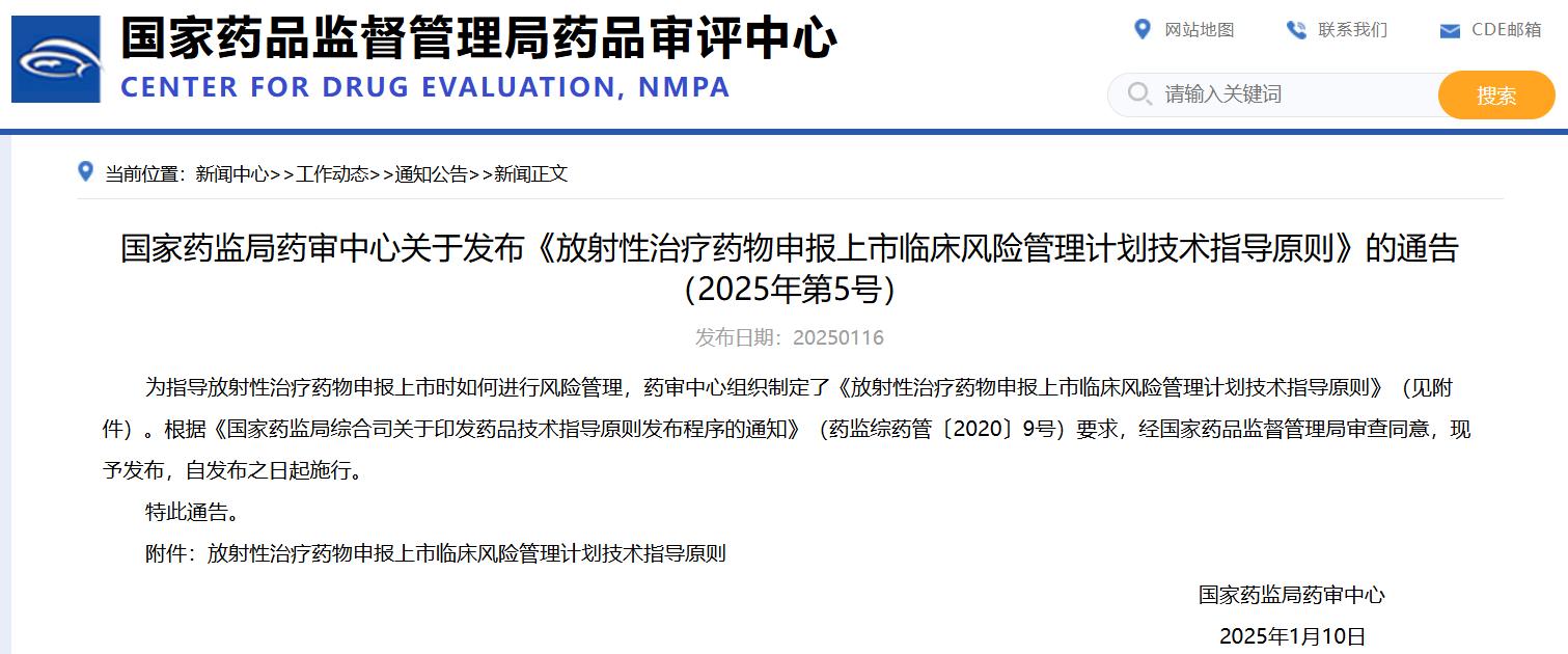 國家藥監(jiān)局藥審中心關(guān)于發(fā)布《放射性治療藥物申報上市臨床風(fēng)險管理計劃技術(shù)指導(dǎo)原則》的通告(2025年第5號)