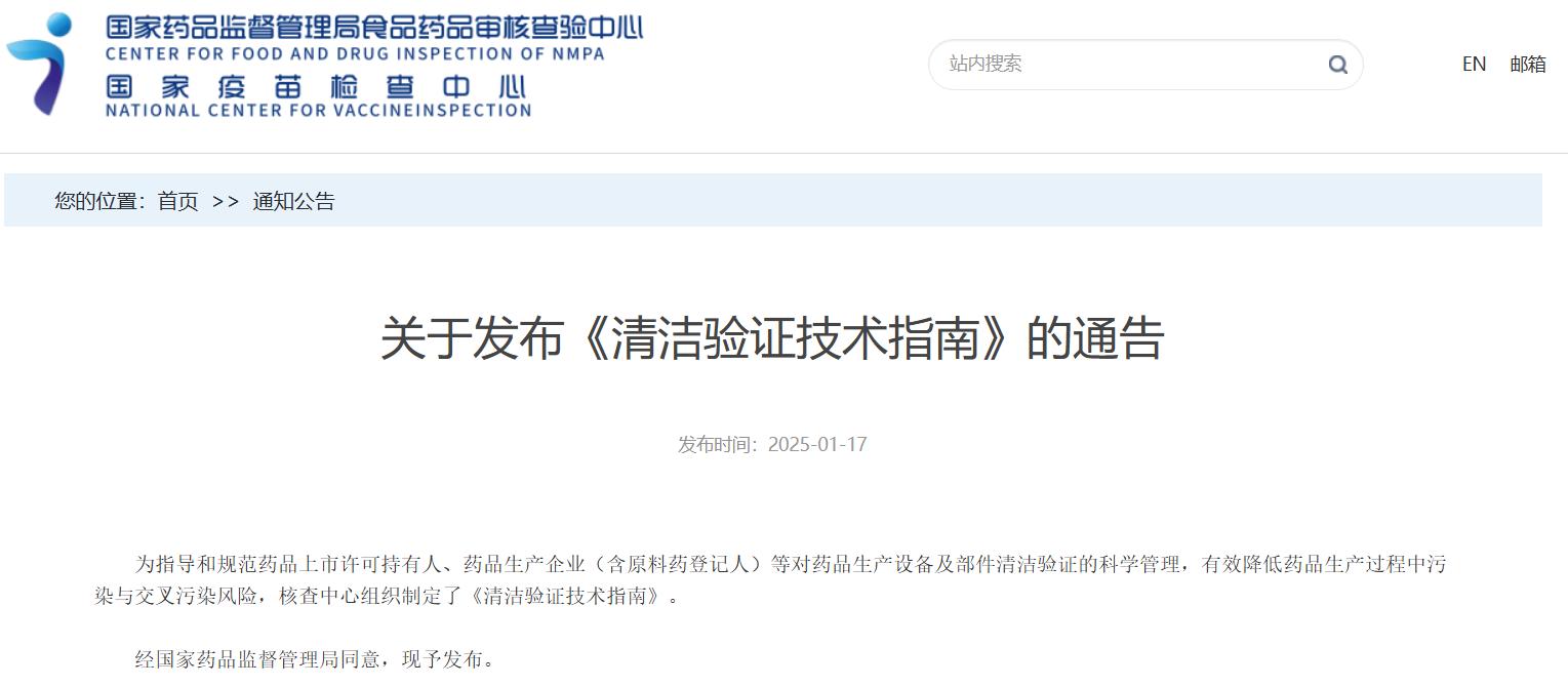 國家藥監(jiān)局核查中心關(guān)于發(fā)布《清潔驗證技術(shù)指南》的通告