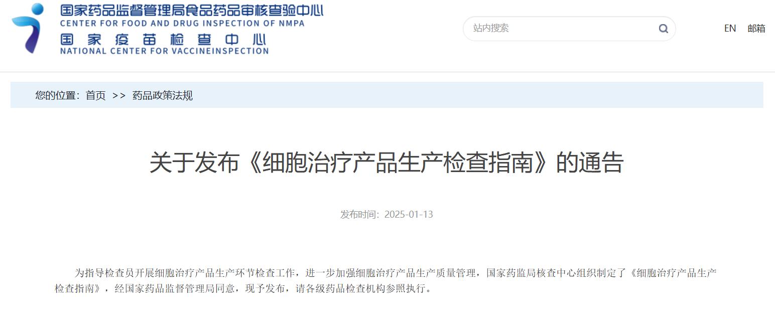 國家藥監(jiān)局核查中心關(guān)于發(fā)布《細(xì)胞治療產(chǎn)品生產(chǎn)檢查指南》的通告