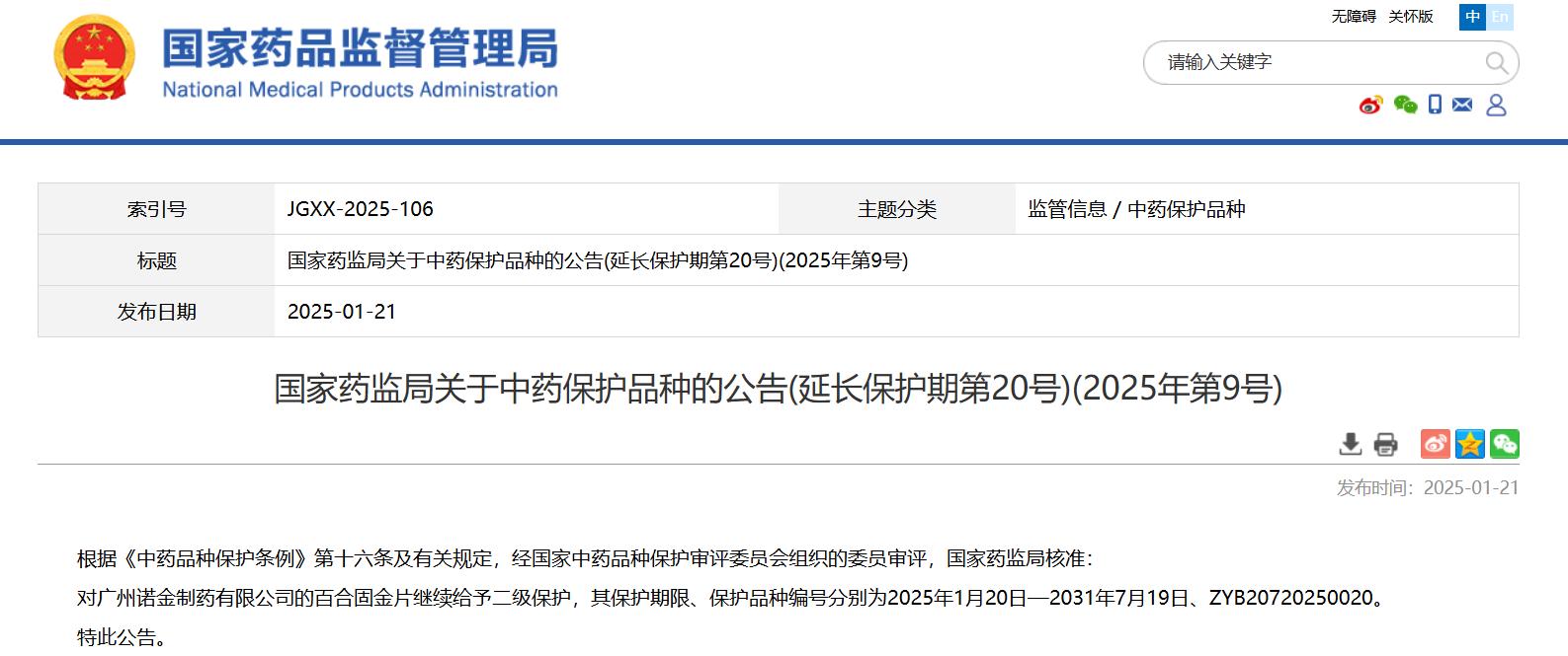 國家藥監(jiān)局關(guān)于中藥保護(hù)品種的公告(延長保護(hù)期第20號)(2025年第9號)