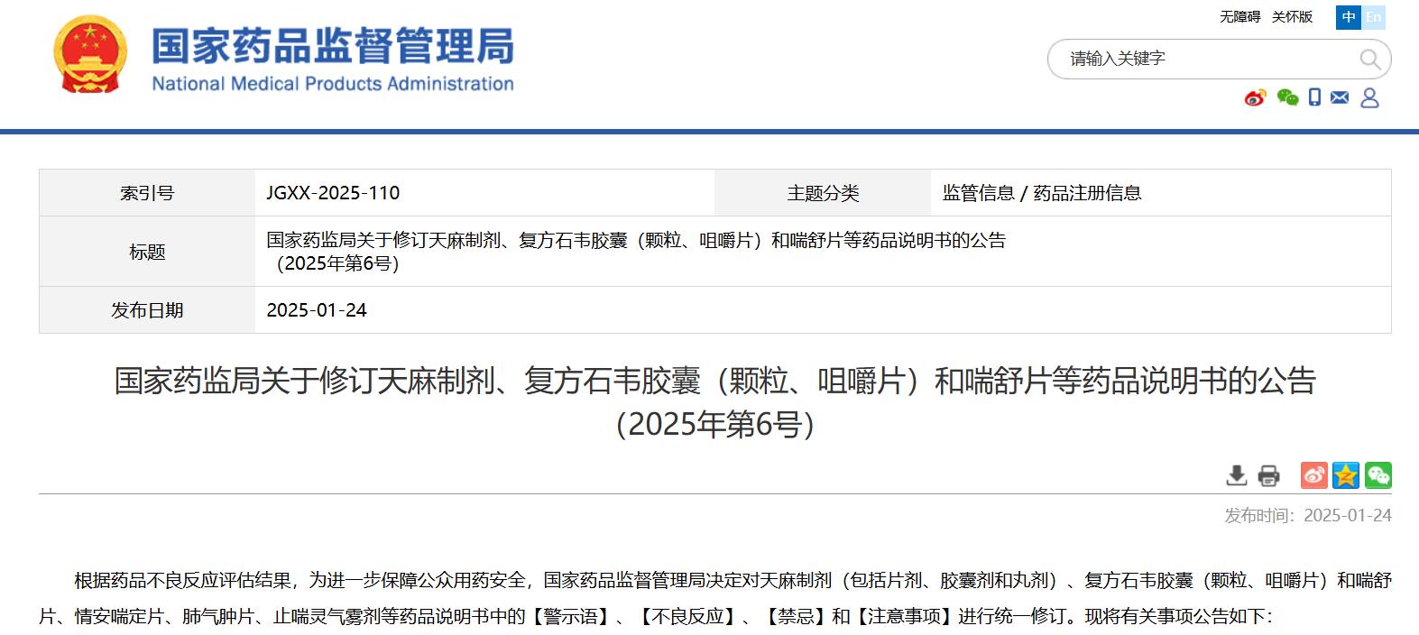 國家藥監(jiān)局關(guān)于修訂天麻制劑、復(fù)方石韋膠囊(顆粒、咀嚼片)和喘舒片等藥品說明書的公告(2025年第6號)