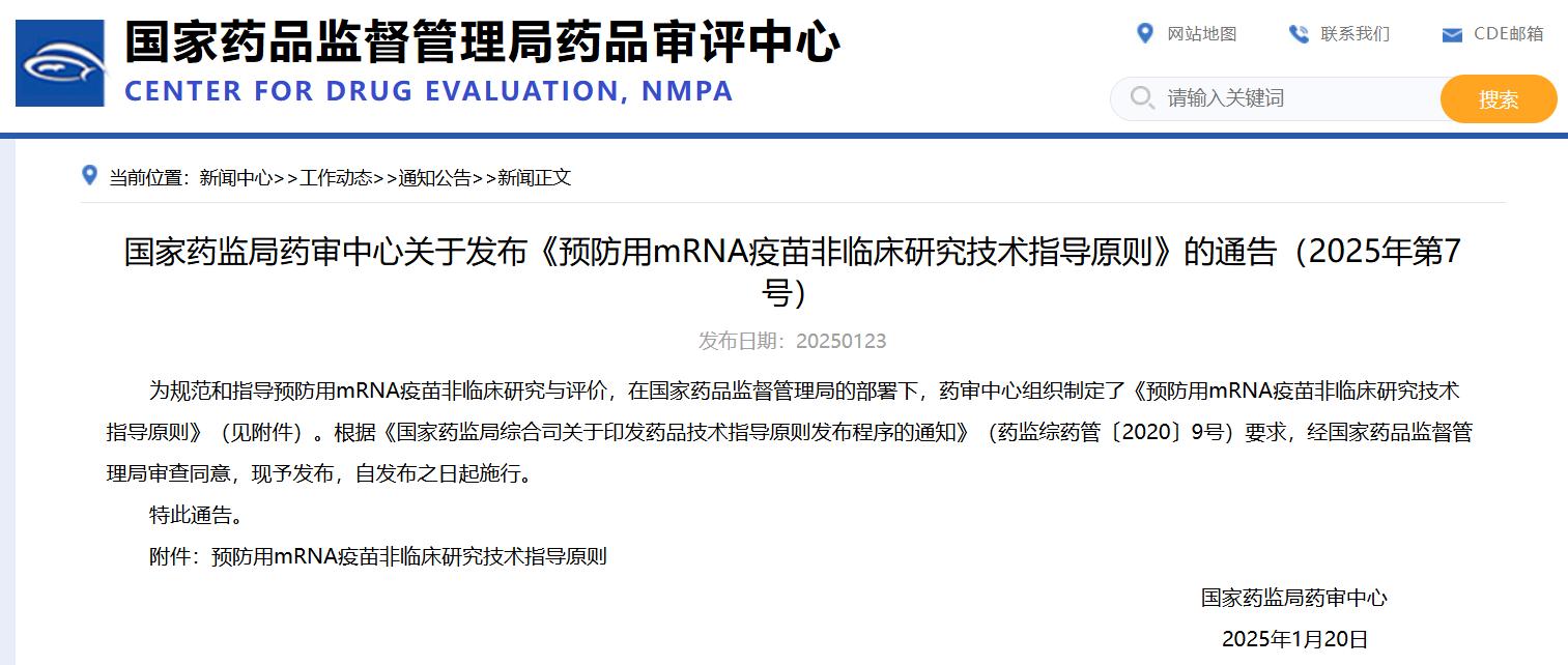 國家藥監(jiān)局藥審中心關(guān)于發(fā)布《預(yù)防用mRNA疫苗非臨床研究技術(shù)指導(dǎo)原則》的通告(2025年第7號)