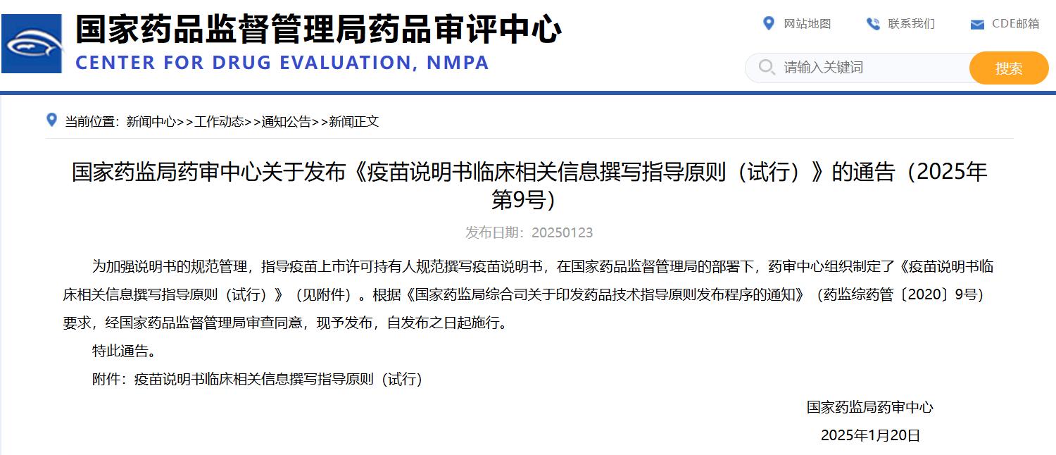 國家藥監(jiān)局藥審中心關(guān)于發(fā)布《疫苗說明書臨床相關(guān)信息撰寫指導(dǎo)原則(試行)》的通告(2025年第9號)