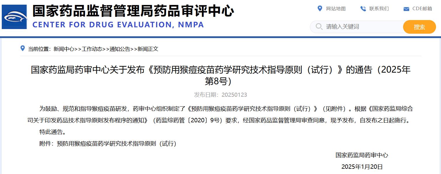 國家藥監(jiān)局藥審中心關(guān)于發(fā)布《預(yù)防用猴痘疫苗藥學(xué)研究技術(shù)指導(dǎo)原則(試行)》的通告(2025年第8號)