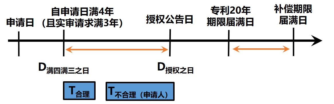 發(fā)明專利權(quán)補償期限=(D授權(quán)之日-D滿四滿三之日)-T合理-T不合理(申請人)