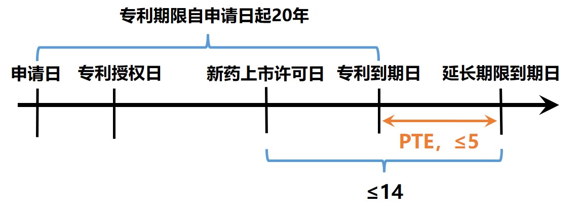 ● 美國:PTE=臨床研究時間的1/2+注冊審批時間;整個專利期限恢復(fù)≤5年,并且在FDA批準(zhǔn)NDA后,剩余的專利期限≤14年。