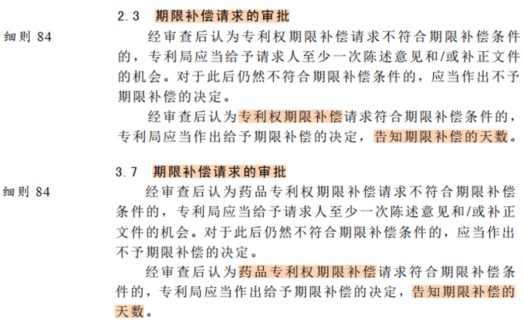 《審查指南》第五部分第九章2.3和3.7期限補償請求的審批作出如下規(guī)定,經(jīng)審查后認(rèn)為專利權(quán)期限補償請求符合期限補償條件的,均由專利局作出期限補償?shù)臎Q定,并告知期限補償?shù)奶鞌?shù)。