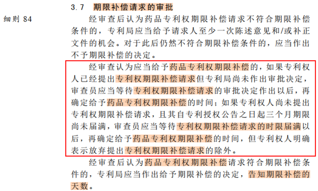 經(jīng)批準(zhǔn)認(rèn)為應(yīng)當(dāng)給予藥品專利權(quán)期限補償請求的,如果專利權(quán)人已經(jīng)提出專利權(quán)期限補償請求但專利局尚未審批決定,審查員應(yīng)當(dāng)?shù)却龑@麢?quán)期限補償請求的審批決定作出以后,再確定給予藥品專利權(quán)期限補償?shù)臅r間;如果專利權(quán)人尚未提出專利權(quán)期限補償請求,且其自專利授權(quán)公告之日起三個月期限尚未屆滿,審查員應(yīng)當(dāng)?shù)却龑@麢?quán)期限補償請求的時限屆滿以后,再確定給予藥品專利權(quán)期限補償請求的時間,但專利權(quán)人明確表示放棄提出專利權(quán)期限補償請求除外。