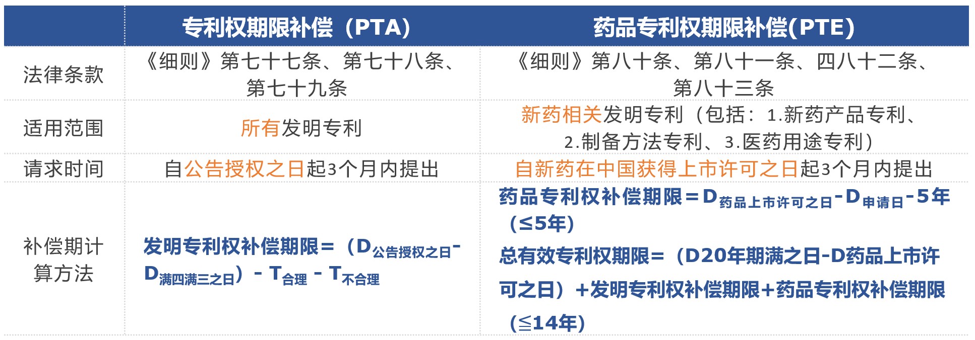 為了更直觀對比專利權(quán)期限補償(PTA)和藥品專利權(quán)期限補償(PTE)的區(qū)別,列出如下表格: