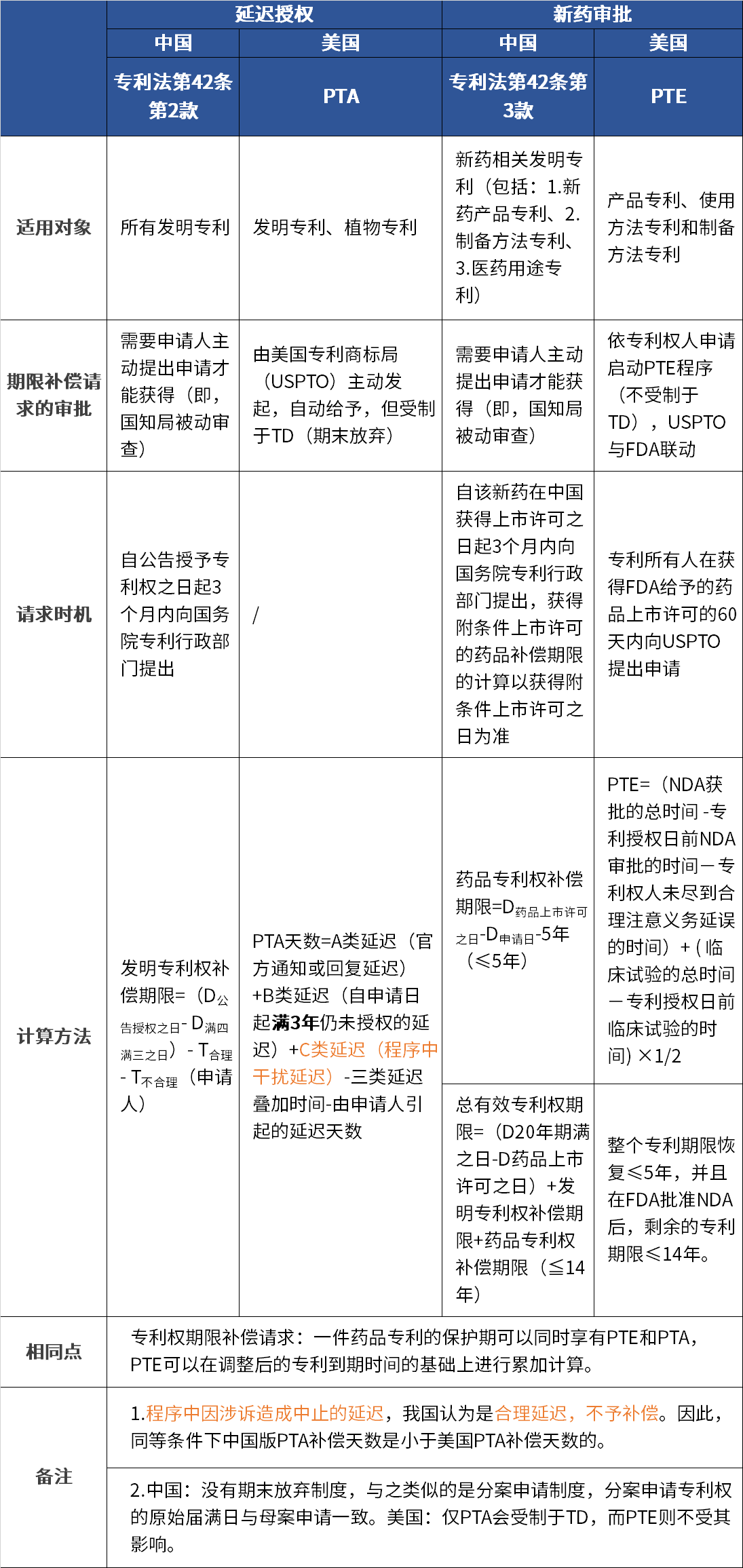 為了更直觀看到新專利法對專利期限補償制度的補充,在這里對新舊專利法進(jìn)行對比。2021年6月1日起施行的專利法主要添加了兩部分的內(nèi)容,分別為延遲授權(quán)以及新藥審批引起的不合理延遲給予的專利期權(quán)補償。新增的兩款內(nèi)容分別與美國提出的PTA(Patent Term Adjustment)和PTE(Patent Term Extension)相對應(yīng)。