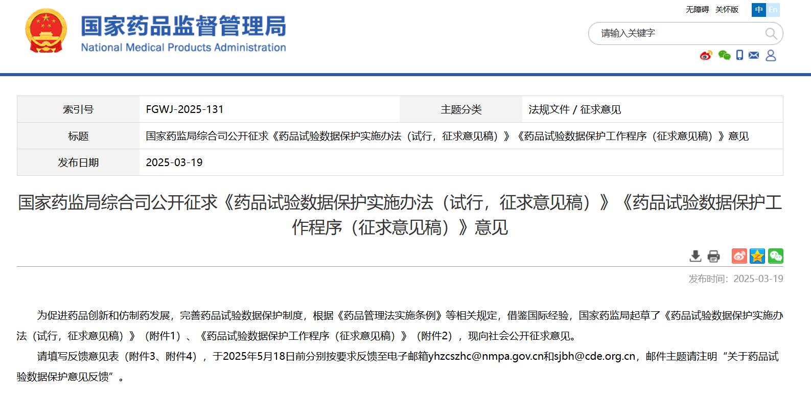 國(guó)家藥監(jiān)局綜合司公開征求《藥品試驗(yàn)數(shù)據(jù)保護(hù)實(shí)施辦法(試行,征求意見(jiàn)稿)》《藥品試驗(yàn)數(shù)據(jù)保護(hù)工作程序(征求意見(jiàn)稿)》意見(jiàn)