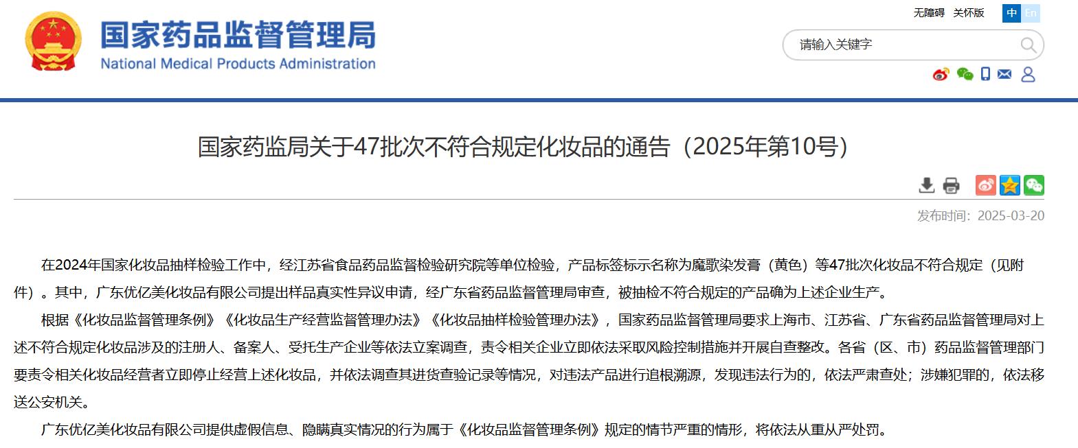 國(guó)家藥監(jiān)局關(guān)于47批次不符合規(guī)定化妝品的通告(2025年第10號(hào))