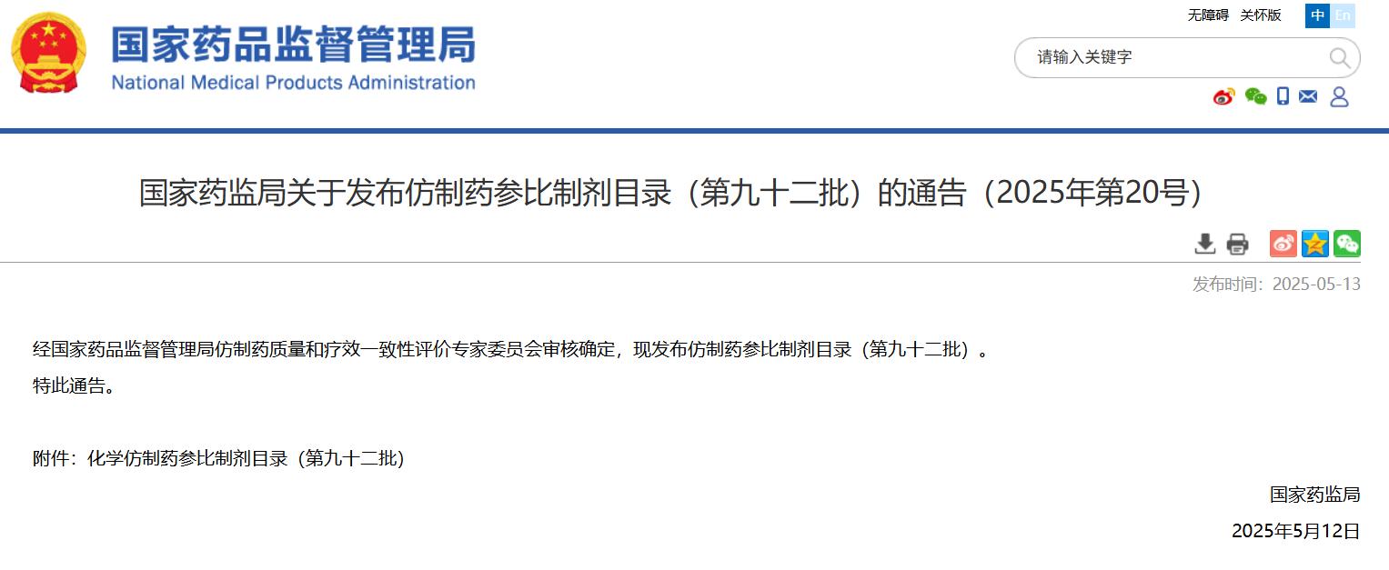 國家藥監(jiān)局關(guān)于發(fā)布仿制藥參比制劑目錄(第九十二批)的通告(2025年第20號)