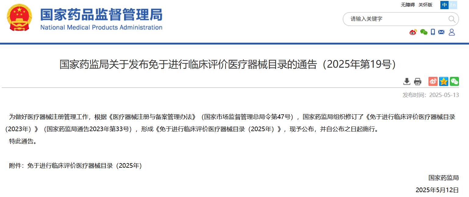 國家藥監(jiān)局關(guān)于發(fā)布免于進行臨床評價醫(yī)療器械目錄的通告(2025年第19號)