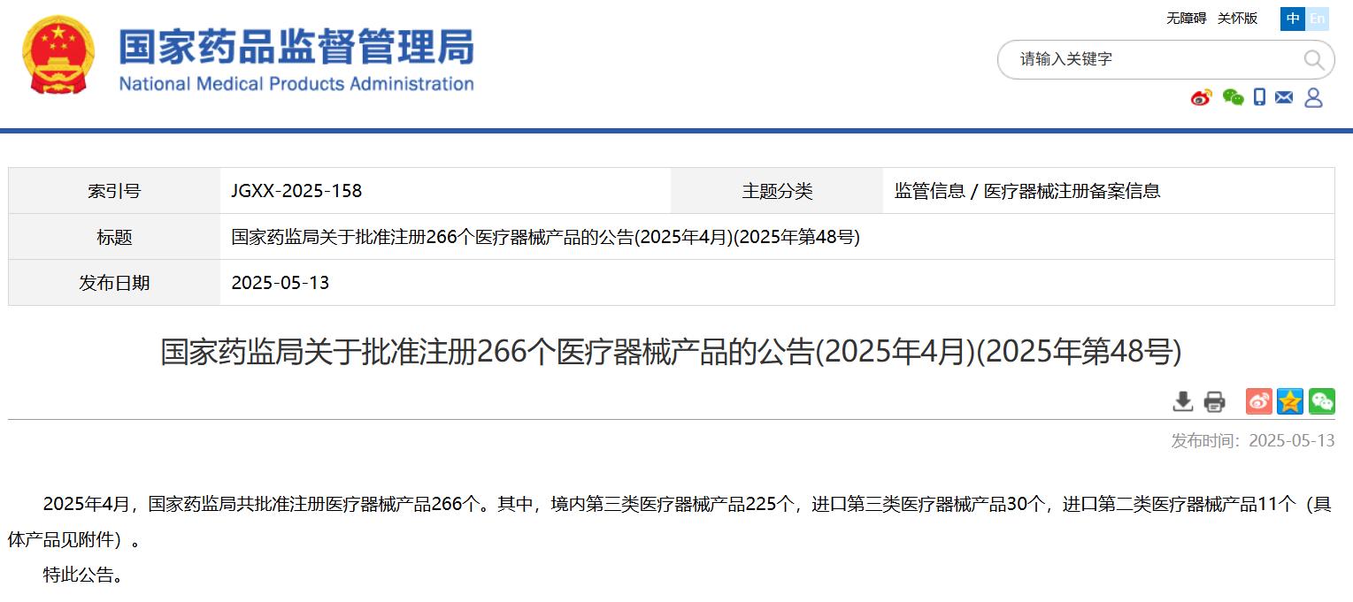 國家藥監(jiān)局關(guān)于批準注冊266個醫(yī)療器械產(chǎn)品的公告(2025年4月)(2025年第48號)