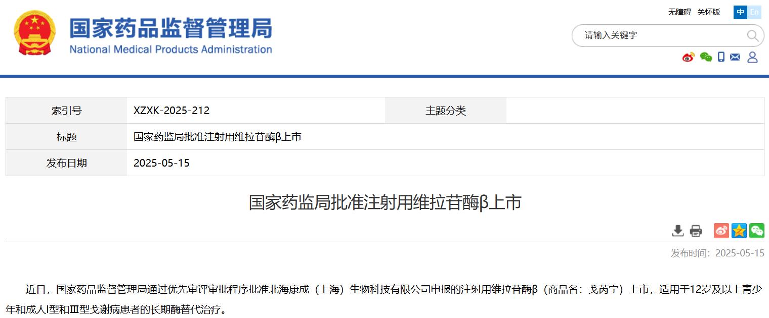 國家藥監(jiān)局批準注射用維拉苷酶β上市