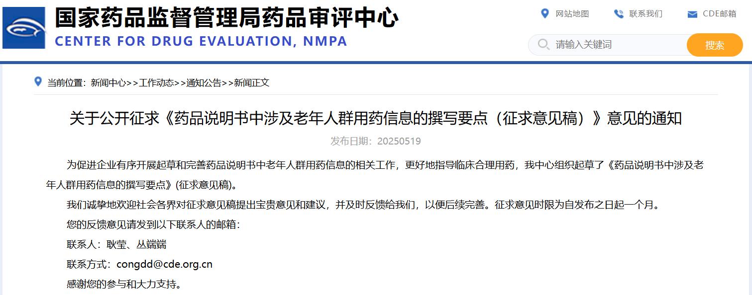 為促進企業(yè)有序開展起草和完善藥品說明書中老年人群用藥信息的相關工作,更好地指導臨床合理用藥,CDE組織起草了《藥品說明書中涉及老年人群用藥信息的撰寫要點》(征求意見稿)。