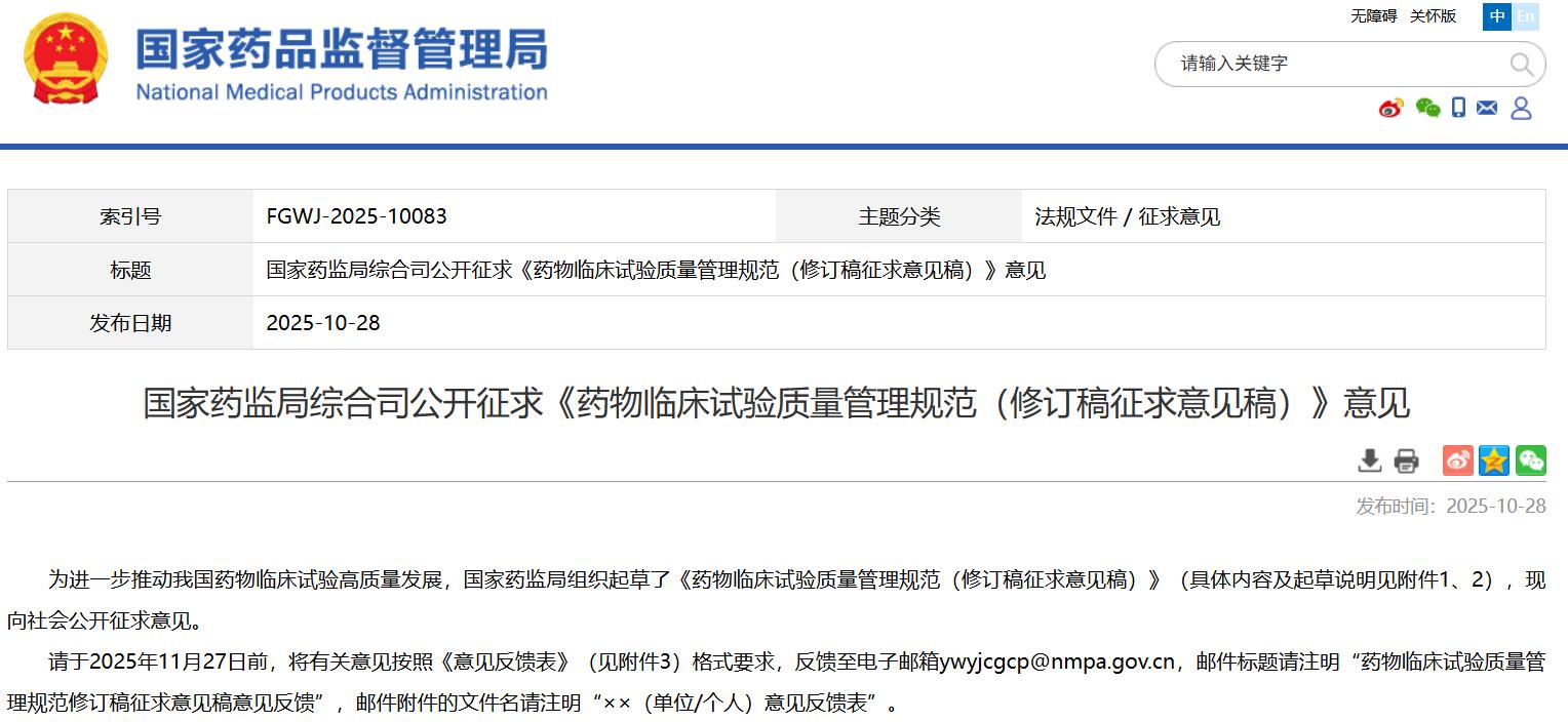 國家藥監(jiān)局綜合司公開征求《藥物臨床試驗(yàn)質(zhì)量管理規(guī)范(修訂稿征求意見稿)》意見