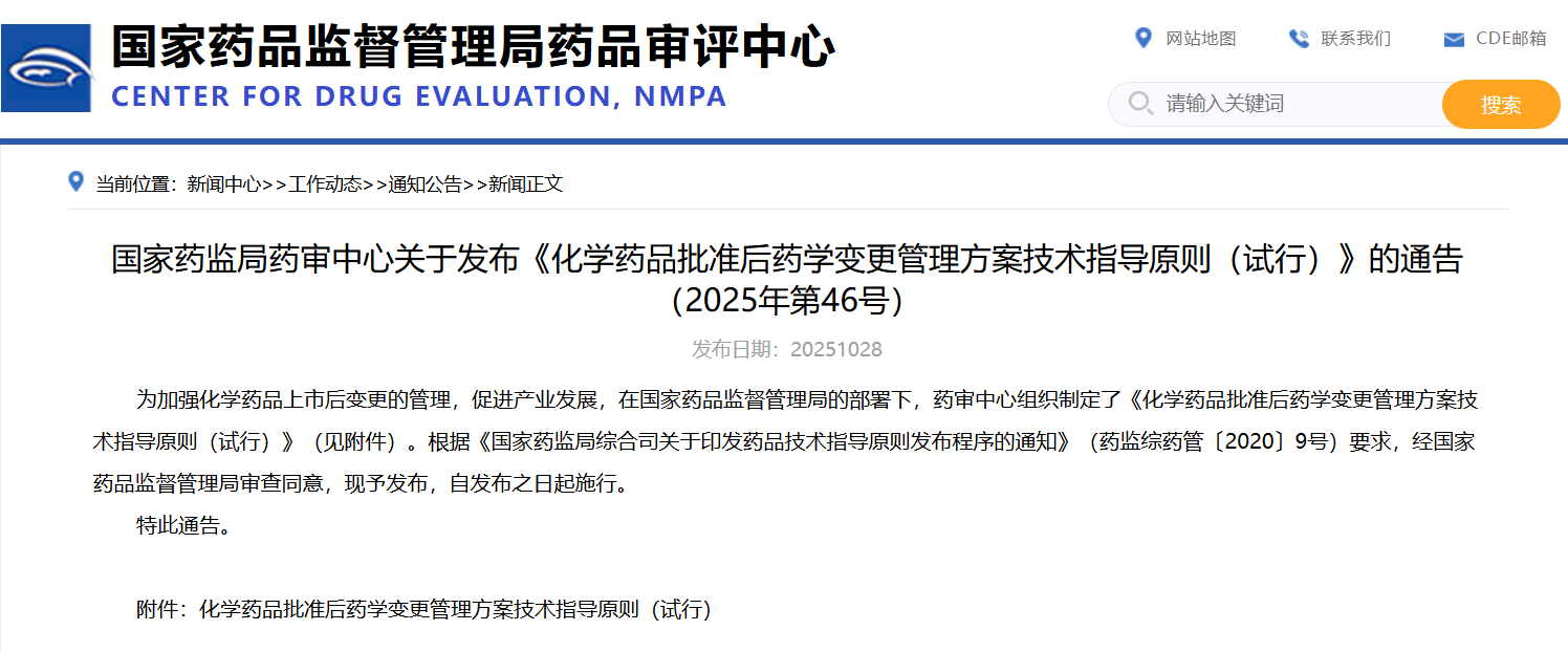 國家藥監(jiān)局藥審中心關(guān)于發(fā)布《化學(xué)藥品批準(zhǔn)后藥學(xué)變更管理方案技術(shù)指導(dǎo)原則(試行)》的通告(2025年第46號)