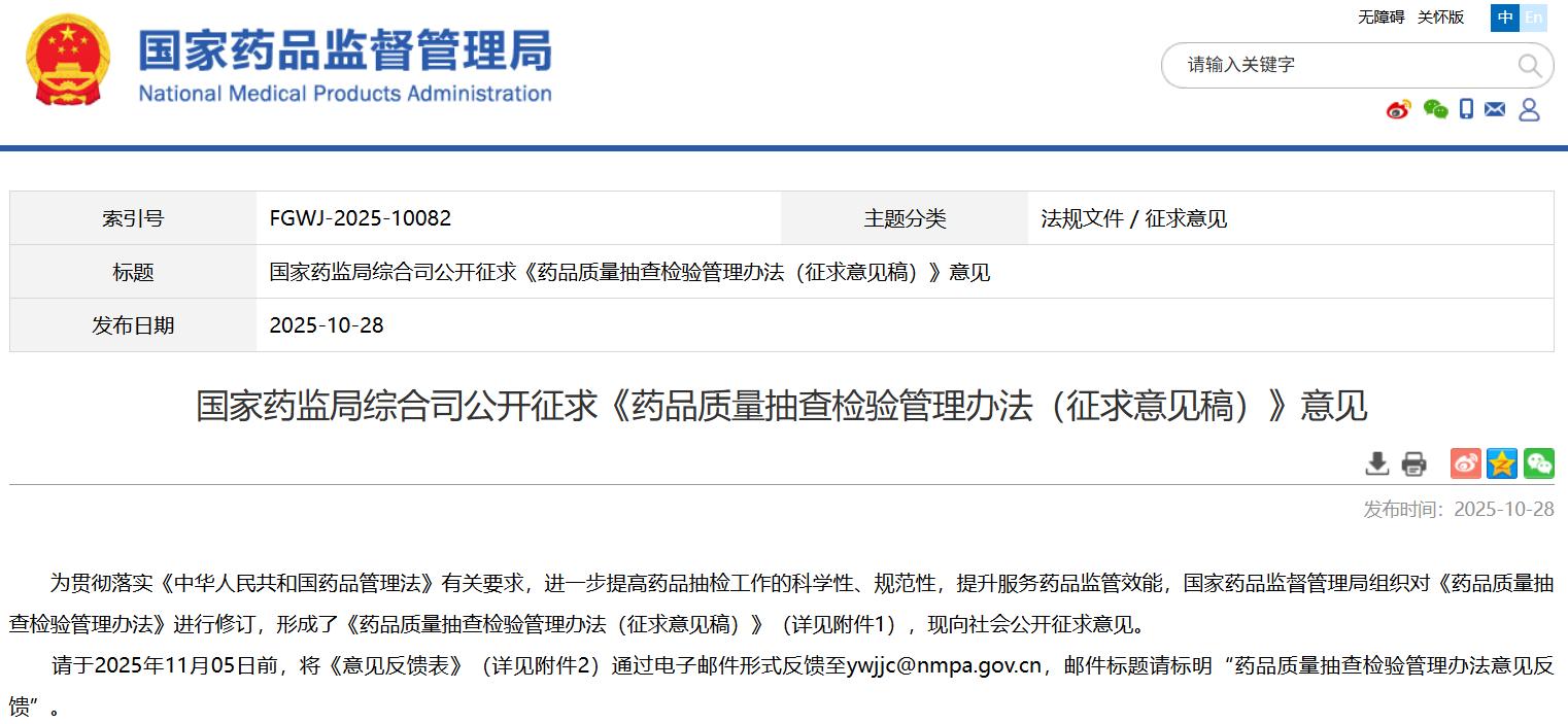 國家藥監(jiān)局綜合司公開征求《藥品質(zhì)量抽查檢驗(yàn)管理辦法(征求意見稿)》意見
