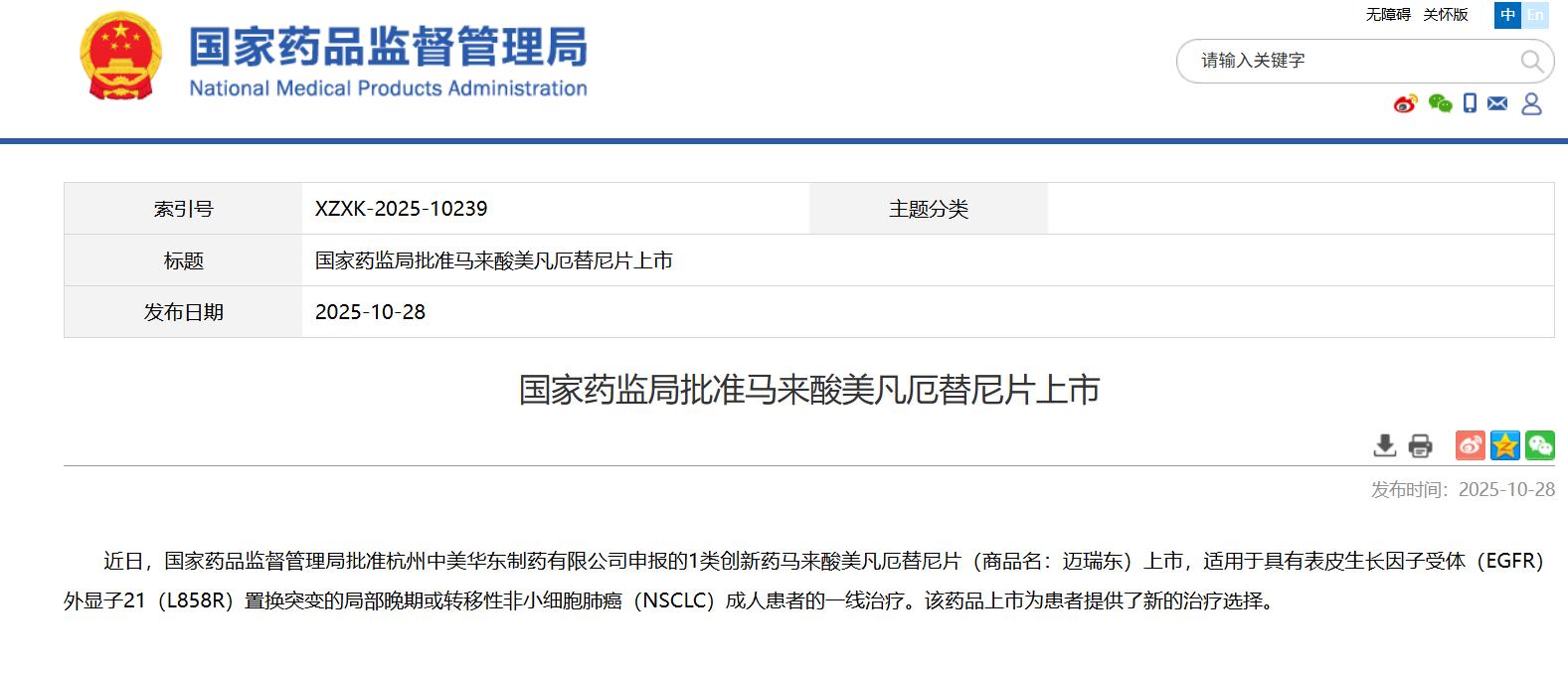 國家藥監(jiān)局批準(zhǔn)馬來酸美凡厄替尼片上市