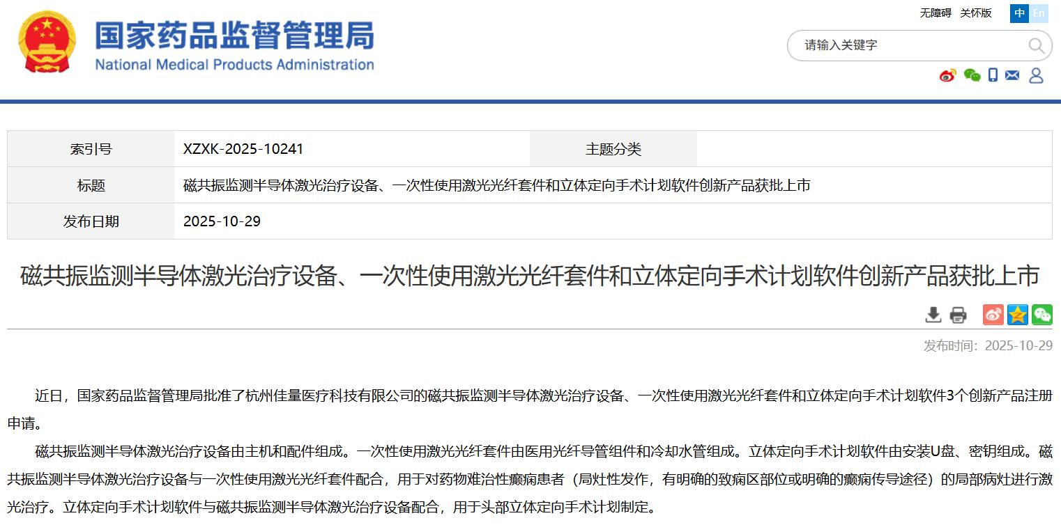 磁共振監(jiān)測半導(dǎo)體激光治療設(shè)備、一次性使用激光光纖套件和立體定向手術(shù)計(jì)劃軟件創(chuàng)新產(chǎn)品獲批上市