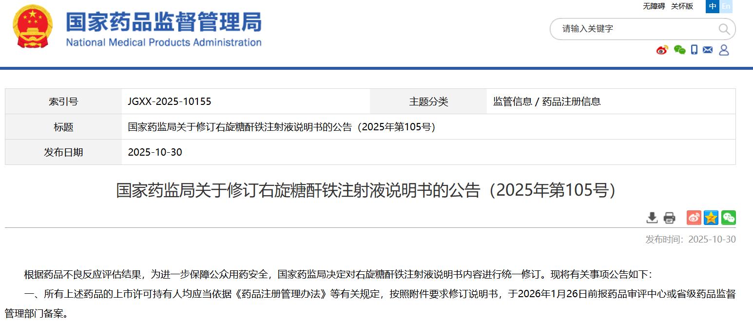 國家藥監(jiān)局關(guān)于修訂右旋糖酐鐵注射液說明書的公告(2025年第105號)