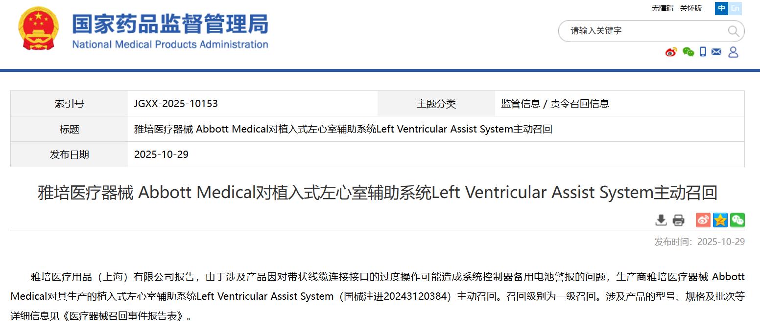 雅培醫(yī)療器械 Abbott Medical對植入式左心室輔助系統(tǒng)Left Ventricular Assist System主動(dòng)召回