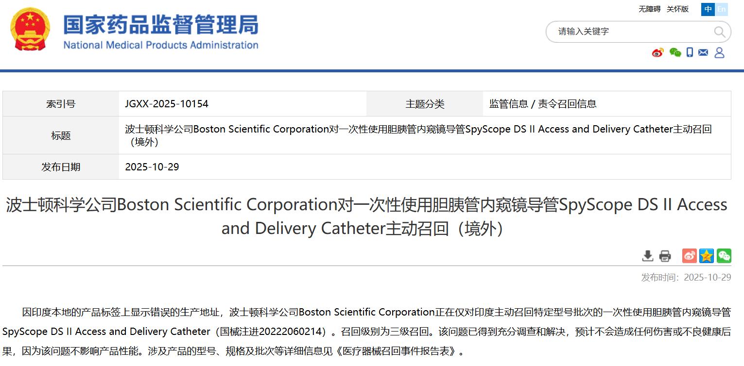 波士頓科學(xué)公司Boston Scientific Corporation對一次性使用膽胰管內(nèi)窺鏡導(dǎo)管SpyScope DS II Access and Delivery Catheter主動(dòng)召回(境外)