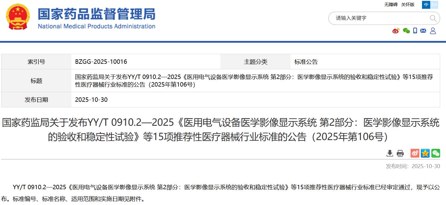 國家藥監(jiān)局關(guān)于發(fā)布YY/T 0910.2—2025《醫(yī)用電氣設(shè)備醫(yī)學(xué)影像顯示系統(tǒng) 第2部分:醫(yī)學(xué)影像顯示系統(tǒng)的驗(yàn)收和穩(wěn)定性試驗(yàn)》等15項(xiàng)推薦性醫(yī)療器械行業(yè)標(biāo)準(zhǔn)的公告(2025年第106號)