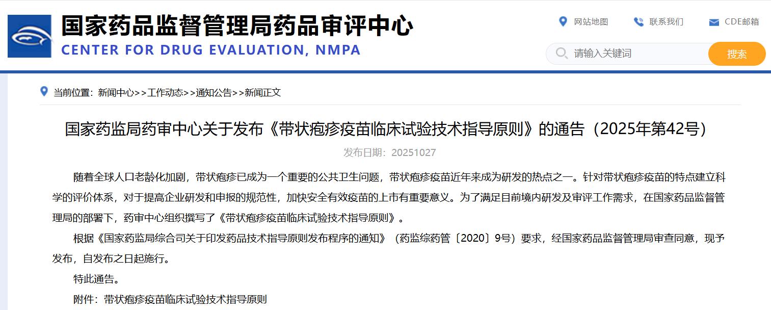 國家藥監(jiān)局藥審中心關(guān)于發(fā)布《帶狀皰疹疫苗臨床試驗(yàn)技術(shù)指導(dǎo)原則》的通告(2025年第42號)