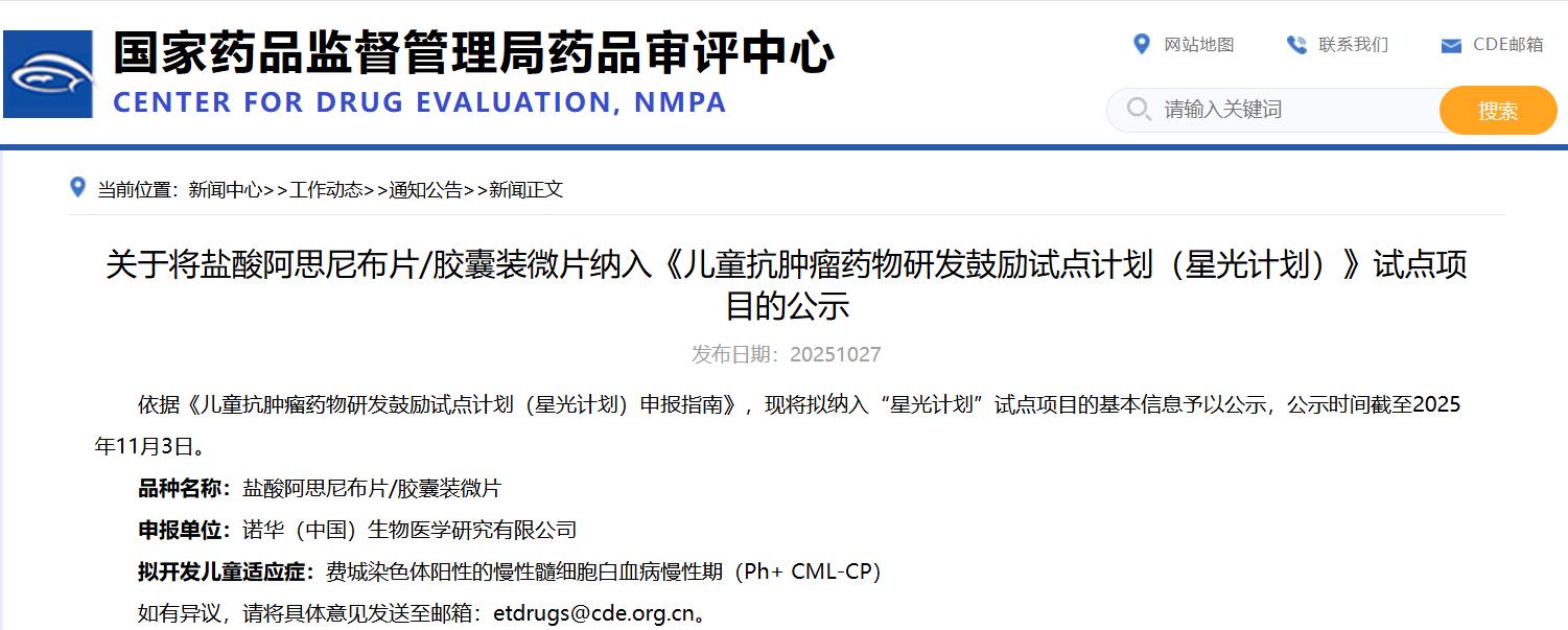 關(guān)于將鹽酸阿思尼布片/膠囊裝微片納入《兒童抗腫瘤藥物研發(fā)鼓勵(lì)試點(diǎn)計(jì)劃(星光計(jì)劃)》試點(diǎn)項(xiàng)目的公示