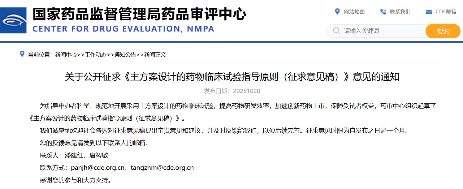 關(guān)于公開征求《主方案設(shè)計(jì)的藥物臨床試驗(yàn)指導(dǎo)原則(征求意見稿)》意見的通知