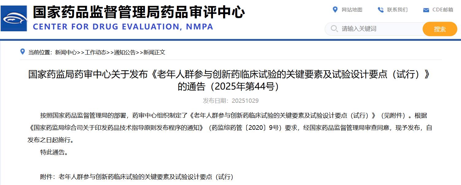 國家藥監(jiān)局藥審中心關(guān)于發(fā)布《老年人群參與創(chuàng)新藥臨床試驗(yàn)的關(guān)鍵要素及試驗(yàn)設(shè)計(jì)要點(diǎn)(試行)》的通告(2025年第44號)